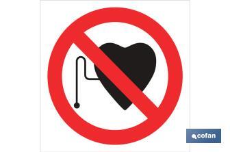 Señal Pictograma "prohibido personas marcapasos" en varias medidas y materiales. El diseño de la señal puede variar, pero en ningún caso se variará el significado de la misma.