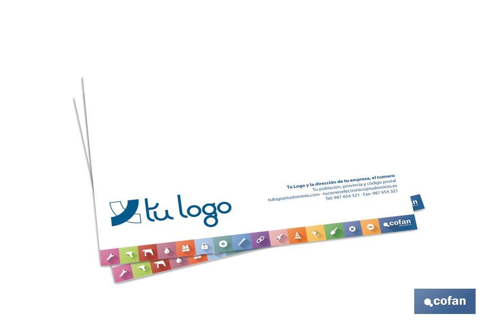 Sobres con ventana o sin ventana. Peso 90 gr. Tamaños disponibles: 115 x 225 mm - 176 x 231 mm Diseño e impresión de la cara principal. * Logotipo de Cofan incluido en el diseño * Tiempo estimado de impresión 15 días