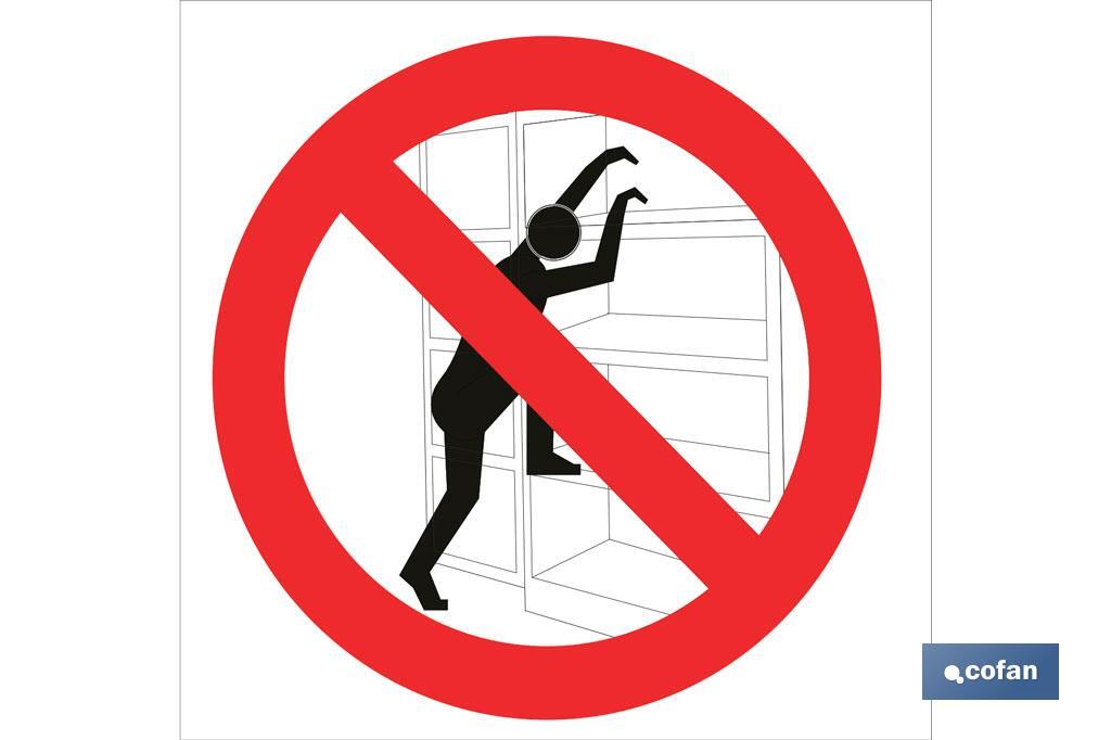 Señal Pictograma "prohibido escalar estanterías" en varias medidas y materiales. El diseño de la señal puede variar, pero en ningún caso se variará el significado de la misma.