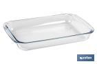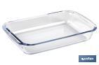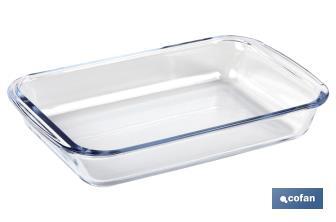 These rectangular baking dishes are made of high-quality borosilicate glass. Important: When removing the baking dish from fridge or freezer, do not introduce it in a pre-heated oven at more than 120°C. They are reusable and easy to use. Capacity / Size / Weight: 1,500 ml / 29.6 x 17.8 x 5 cm. / 720 g; 2,200 ml / 34.5 x 20.7 x 5 cm / 1,300 g; 3,000 ml / 39.3 x 23.6 x 5.2 cm / 1,750 g.