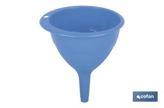 These blue plastic funnels are suited for food handling and dishwasher safe. Available diameters: 11, 13, 16 and 22.5 centimetres. You can use these funnels for an easy, clean and fast pouring. They are long-lasting products, with a safe grip and a hanging hole.