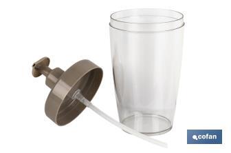 This soap dispenser is intended to ration the desired amount of soap in an easy way. It can be refilled with soap. The soap dispenser has a capacity of 870ml. It has a modern and contemporary design with an hygienic and clean surface. It is very easy to use, so you only have to gently press the dispenser pump to obtain the desired amount of soap or lotion. This is a practical accessory that can also be used as a dish-washing liquid dispenser. Available in two different colours: white and stone colours. It is sold in packs of 6 pieces or individually. The dispenser measures 22.5 x 9.6cm and is made of polystyrene.