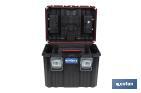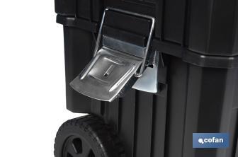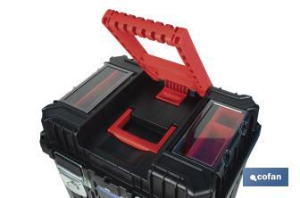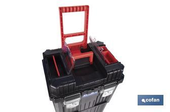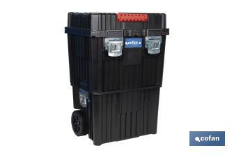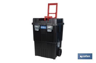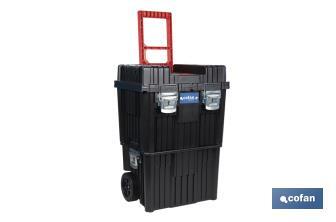 Tool box trolley with two compact drawers, a double handle and wheels. This type of toolbox is perfect for carrying tools easily and conveniently, thanks to its large wheels that facilitate the transport of the tool trolley. It is an essential accessory for professional tasks, industry and automotive sectors, as well as for do-it-yourself projects. The modular body is made of reinforced polypropylene. The toolbox features durable and sturdy ABS latches, a functional deep tray inside and transparent compartments with polycarbonate lids. It also has some metal hooks and two dividers. It can be disassembled for easy transport. The toolbox trolley measures 45 x 36 x 64cm.