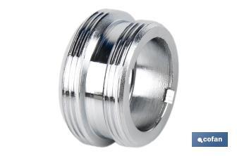 Brass or male-to-male thread adapter suitable for kitchen or bathroom tap aerators with a thread of 22 x 1 and 24 x 1. This type of adapter is ideal for transferring any fitting from 22 mm female thread to 24 mm male thread and vice versa. It is made of silver-coloured brass, being resistant to oxidation, corrosion and ageing. It has a rubber sealing washer to prevent leakage on the 24 mm thread, and an inner groove on the 22 mm thread, which is ideal for removing the adapter with a simple coin. The thread tap adapter has a total height of 12mm. This thread tap aerator adapter is sold in single units.