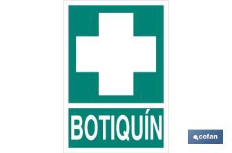 Señal de evacuación Botiquín. Tamaño y material a elegir (luminiscente y adhesivo). El diseño de la señal puede variar, pero en ningún caso se variará el significado de la misma.