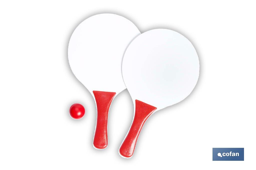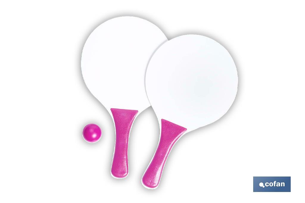 Par de palas de playa en madera natural con mango reforzado en variada gama de vivos colores. Presentadas en bolsa redecilla con pelota a juego. Medida 190x330 mm - 330 gr