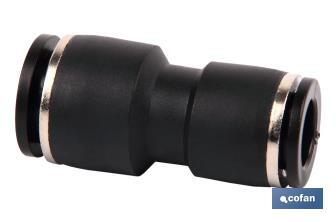Quick coupling reduction fittings, completely made of plastic, recoverable from instant connection for pipes from 4mm up to 12mm exterior. Suitable for compressed air installations. Completely metallic body with an easy view of the fitting's caliper. Tota