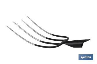 Fourches forgées en acier spécial. Fabriquées avec des dents aiguisées et trempées sur toute leur longueur. Ces fourches sont protégées avec de la peinture très résistante à l'oxydation qui permet une plus longue durée de vie utile. Elles sont recommandées pour l'usage en agriculture pour tirer le meilleur parti de la terre. Disponibles en plusieurs dimensions et nombre de dents.