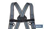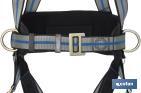 Harnais antichute avec 2 points d'ancrage sternal/dorsal. Sa ceinture de positionnement est équipée avec 2 boucles porte-outils latérales et 1 anneau porte-outils à la ceinture pour ajouter le mousqueton. Les cuisses et les épaules sont différentiées par deux couleurs. Il peut supporter jusqu'à 140 kg de poids. Les cuisses et la taille sont réglables avec une sangle de siège pour plus de confort et de maintien. Il est très commode et facile à utiliser. Il est de très bonne qualité, en assurant la sécurité de l'utilisateur à tout moment.