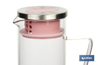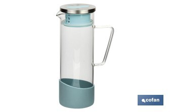 Pichet fabriqué en verre borosilicate, acier inoxydable et silicone de très bonne qualité. Sa capacité est de 1,3 litres. Il est disponible en plusieurs couleurs : rouge, rose, terre, violet et bleu. C'est un produit très léger et facile à utiliser. Exempt d'agents polluants et prend soin de l'environnement. Il possède un diamètre de 10 cm, une largeur de 16,5 cm et une hauteur de 27,5 cm.