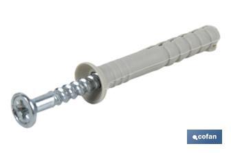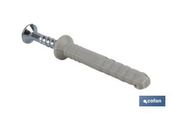 These 500 hammer fixings with countersunk head are supplied in a container. They are easy to nail and fix. The plugs can be inserted with just a blow of the hammer. Once inserted, the screws can be removed by using a screwdriver. The countersunk head of the plugs is ideal for optimizing assembly time in all types of installations and prevents the plug from sliding into the previously perforated hole. They support a maximum load of 27kg. The screws feature a PZ2 drive and needs a drill bit of 6mm in diameter. Suitable for both indoors and outdoors. The hammer fixings measure 6mm in diameter and 40mm in length. The plugs are made of PP and their screw is made of zinc-plated steel with a minimum 5 micron coating.