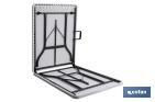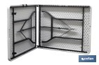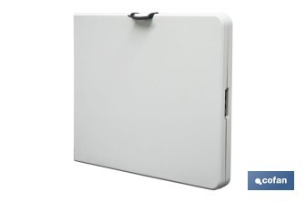 Mesa retangular dobrável branca em polietileno de alta densidade com estrutura em aço pintado. Ideal para eventos ou celebrações, bem como para ter uma mesa ocasional em jardins, campismo, trabalhos especiais, etc., uma vez que é adequada para utilização no interior e no exterior. Resiste a temperaturas extremas, é impermeável e resistente aos raios UV. É uma mesa robusta, fácil de abrir e fechar, que ocupa pouco espaço quando esta dobrada. Inclui uma pega para facilitar o transporte. Possui barras transversais ergonómicas e um placa de mesa articulada com 45 mm de espessura para um armazenamento ideal, com bloqueio automático concebido para evitar que a mesa seja dobrada acidentalmente. Ideal para 6/8 pessoas e suporta um peso máximo de 150 kg. Medidas da referência 43051041: NÃO DOBRADA: 180 cm de comprimento, 75 cm de largura e altura a partir do solo 72 cm. DOBRADA: 90 x 37,5 x 9 cm. Peso líquido: 14 kg. Medidas da referência 43051011: NÃO DOBRADA: 180 cm de comprimento, 70 cm de largura e altura a partir do solo 72 cm. DOBRADA: 90 x 70 x 9 cm. Peso líquido: 13 kg.