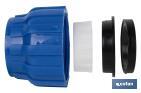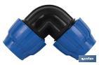 Joelho 90° para tubos de polietileno (PE) Adequado para trabalhar em sistemas de condução de água com uma pressão nominal de 16 bares. Este joelho 90° está fabricado em polietileno de alta qualidade e durabilidade, com um acabamento negro e duas porcas em azul. Dispõe de junta de estanquecidade em EPDM que garante um ajuste forte, duradouro e sem fugas. Disponível em diferentes medidas. Pode ser adquirido em pack ou de forma unitária.