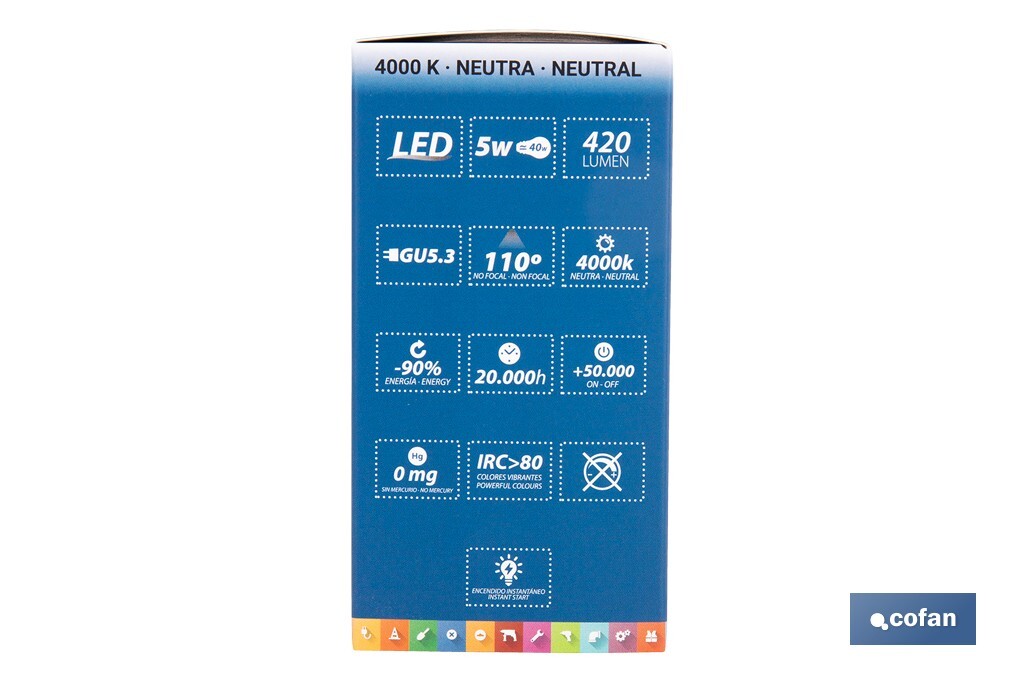 La lámpara LED COB GU 5.3 de 5W es la solución perfecta para quienes buscan una iluminación eficiente, duradera y de alta calidad en entornos residenciales, comerciales o técnicos. Con una potencia de solo 5W y un rendimiento lumínico de 420 lúmenes, esta lámpara proporciona una iluminación uniforme y agradable, ideal para sustituir halógenas tradicionales y reducir el consumo energético sin perder calidad de luz.Esta lámpara funciona a 12V DC y presenta un consumo de 833 mA, lo que la hace ideal para instalaciones de bajo voltaje, como caravanas, iluminación técnica, vitrinas o sistemas de iluminación LED profesional. Gracias a su tecnología COB (Chip On Board), se consigue una mayor intensidad luminosa con menor dispersión térmica, lo que se traduce en mayor eficiencia y durabilidad.Con una temperatura de color de 4000 K, proporciona una luz natural neutra, perfecta para tareas cotidianas, ambientes de trabajo, oficinas, cocinas o baños. Su ángulo de apertura de 110° asegura una cobertura amplia y uniforme, evitando sombras y zonas oscuras.Esta lámpara cuenta con una vida útil de hasta 20.000 horas y está preparada para soportar más de 50.000 ciclos de encendido/apagado, lo que la convierte en una opción fiable para lugares con uso intensivo. Además, ofrece hasta un 90 % de ahorro energético respecto a bombillas halógenas tradicionales, lo que supone una reducción significativa en la factura eléctrica a medio y largo plazo.Con unas dimensiones compactas de 55 mm de largo x 50 mm de diámetro, esta bombilla se adapta perfectamente a luminarias empotradas, focos de techo, rieles o downlights compatibles con casquillo GU5.3, manteniendo un diseño discreto y funcional.Por su alto rendimiento y bajo consumo, esta lámpara LED GU 5.3 es una opción excelente para profesionales de la electricidad, instaladores, interioristas y clientes finales que desean una iluminación fiable y respetuosa con el medio ambiente. Además, al no emitir calor excesivo ni radiación UV, es segura para materiales sensibles y perfecta para su uso prolongado.
